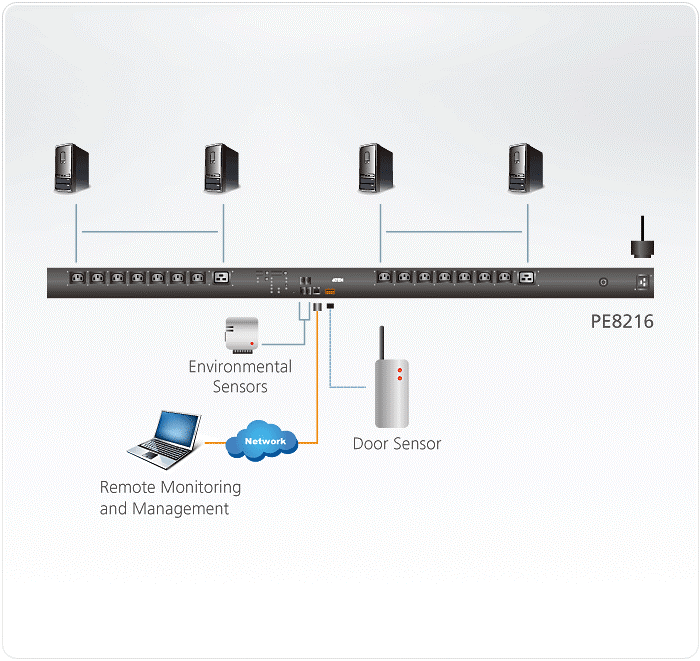 PE8216G обеспечивает удаленное управление питанием и отслеживание состояния питания в реальном времени, позволяя контролировать и отслеживать состояние питания подключенных к PDU устройств на уровне PDU, блока или отдельных розеток практически из любой точки мира с помощью Internet соединения по протоколу TCP/IP.