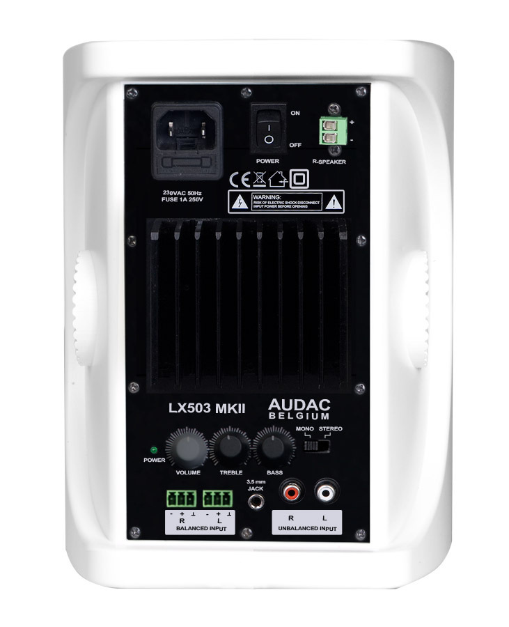 Комплект LX503MK2/W является модификацией комплекта активных акустических систем Audac LX503/W. Изменения затронули, в основном, встроенный усилительный модуль. Стереокомплект из двух АС состоит из активного и пассивного громкоговорителей, соединяемых между собой посредством акустического кабеля. Активная акустическая система оборудована встроенным двухканальным усилителем мощностью 40 Вт RMS на канал и набором линейных входов. К имевшимся в предыдущей модели LX503/W стандартным небалансным входам (RCA и 3,5-мм jack) добавился симметричный стереовход (3-контактные клеммные колодки) и переключатель режимов «стерео/моно», изменилась также компоновка служебной панели усилителя. Сохранились аналоговые регуляторы уровня громкости и тембров, кнопка включения/выключения питания, радиатор охлаждения. К активной АС можно напрямую подключить DVD/BD-плеер или любой портативный источник, например, iPad. Обе акустических системы комплекта являются 3-полосными, набор динамиков остался без изменений (кроме магнитного экранирования). Каждая АС укомплектована 5,25" НЧ-динамиком, 1" СЧ/ВЧ-динамиком и ¾-дюймовым купольным твитером. Разделение полос осуществляют пассивные кроссоверы. У обеих АС предусмотрен фазоинверторным портом с выходом на лицевую панель и кронштейн для настенного монтажа.