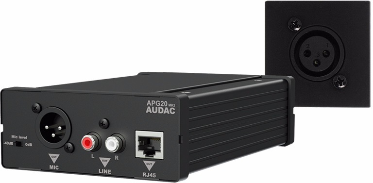 Комплект: APG20MK2 (приемник 2хRCA) + PSD242 (блок питания) + WMI18/B (передатчик 1хXLR) + CP45CF1/B (рамка на 1 модуль).