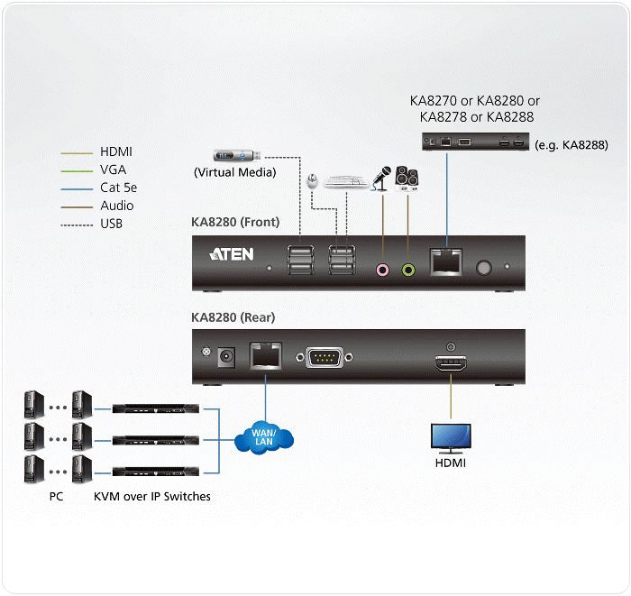 KA8280-AX-G – Dual HDMI KVM over IP Консольная станция ATEN KA8280 позволяет удаленно получать доступ с автономной консоли, заменяющей ПК или ноутбук к IP KVM Переключателям для мониторинга и управления серверами в любом месте, где необходимы мгновенный доступ и высокий уровень безопасности. Она идеально подходит для таких применений, как студии, офисы, центры обработки данных, станции широковещания, диспетчерские или центры управления сетями.