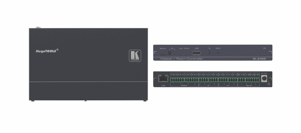SL-240C – компактный центральный контроллер помещения для управления комплексом аудио и видео оборудования через сеть Ethernet (питание контроллера POE). Контроллер включает 4 двунаправленных интерфейсов RS-232, 4 ИК выхода, 4 GPIO порта, 4 реле типа «сухой» контакт. Прибор обеспечивает надежное управление масштабаторами, дисплеями, аудио процессорами, проигрывателями, проекционными экранами, шторами, освещением и т.п. Сетевые преобразователи интерфейсов Kramer обеспечивают расширение портов управления через сеть Ethernet. поддержка протоколов управления большинства современного аудио и видео оборудования.