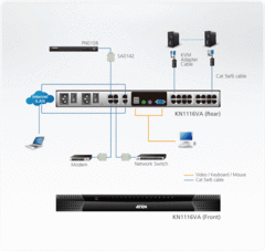 IP KVM Переключатель ATEN KN1116VA поддерживает внеполосный доступ через внешний модем в случае аварии сети для поиска и устранения неисправностей на уровне BIOS и управление энергопитанием подключенных устройств, используя блоки распределения питания (PDU).