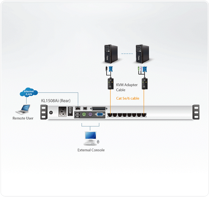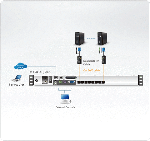 Модель IP KVM switch KL1508Ai обеспечивает возможность удобной работы, как на локальных рабочих местах системных администраторов, так и с удаленных рабочих мест, благодаря наличию у переключателя функции IP-доступа. Используя протокол TCP/IP для связи, KL1508Ai обеспечивает доступ с любого компьютера в сети LAN, WAN или Интернет.