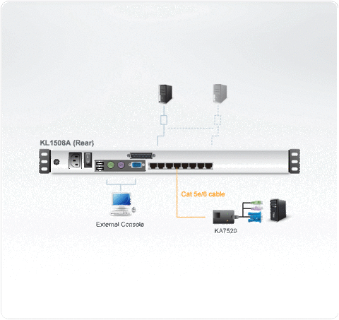 С целью повышения надежности соединения с компьютерами, а также для удобства монтажа используются разъемы RJ-45 и кабель категории 5e/6. Использование специальных KVM-Кабель-Адаптеров для соединения позволяет применять в установке с KL1508AN любые сочетания компьютеров PC, Mac и Sun, а также последовательные устройства.