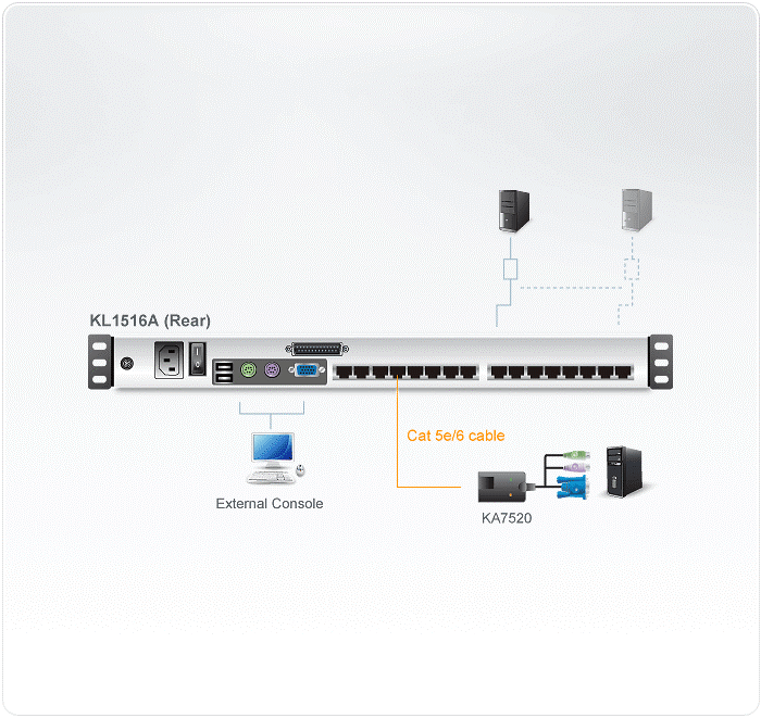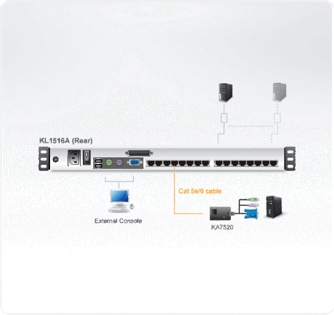 Для повышения надежности и эффективности для соединения компьютеров используются разъемы RJ-45 и кабель Cat 5e/6. При использовании соединительных кабелей KVM модель KL1516A позволяет управлять любой комбинацией ПК, компьютеров Mac, Sun и устройств последовательной передачи данных.