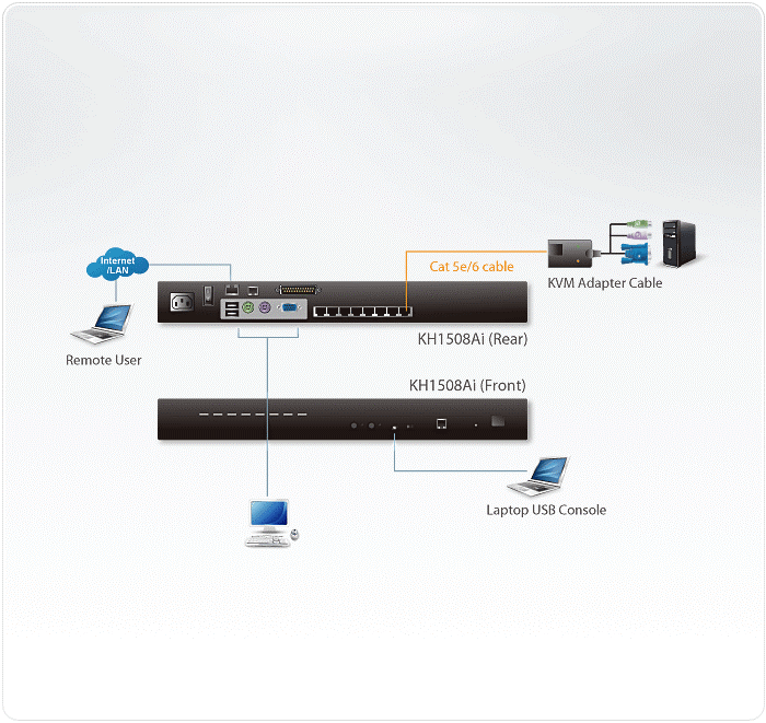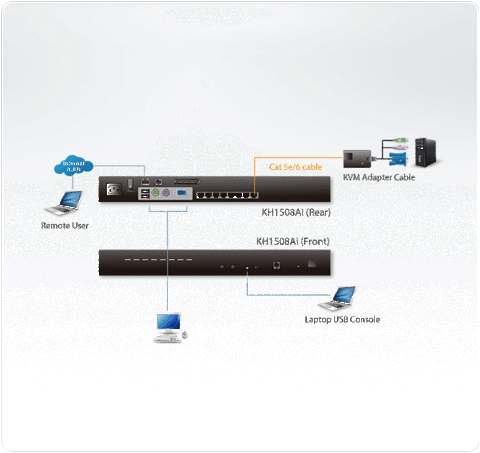 Помимо возможности подключения по TCP/IP, модель KH1508Ai располагает портами консоли, позволяющими локально подключать консоль USB или PS/2 и сеть.