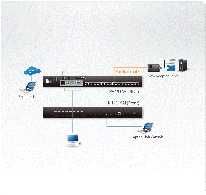 KH1516Ai-AX-G – IP KVM Переключатель ATEN KH1516Ai высокой плотности позволяет подключить 16 компьютеров и идет в корпусе 1U для монтажа в стандартной стойке. С помощью этого переключателя локальные и удаленные операторы могут отслеживать и управлять всем информационным центром предприятия через веб-браузер по Интернету.
