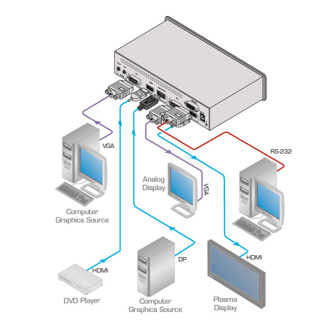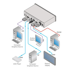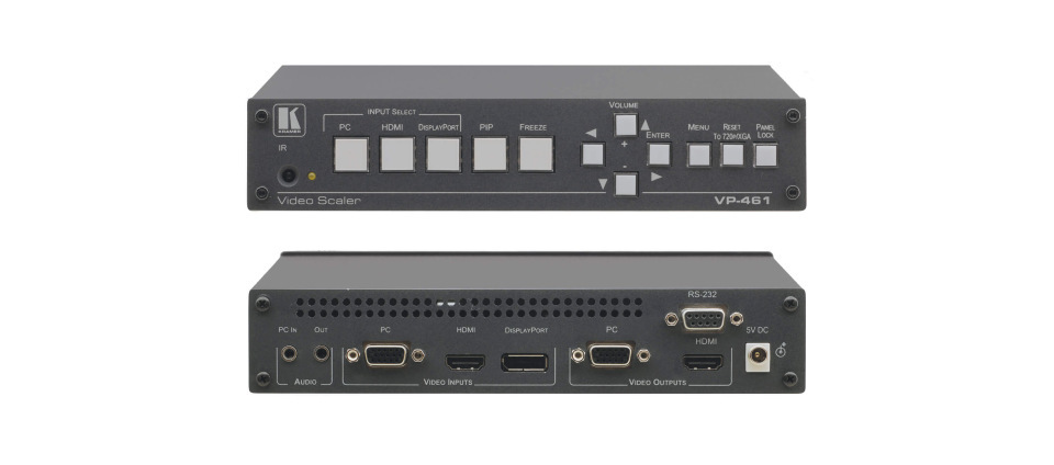 VP-461 представляет собой высококачественный масштабатор видеосигналов. Устройство принимает в обработку один из трех входных сигналов: сигнал PC (VGA или YUV) с 15-контактного разъема типа HD, сигнал HDMI и сигнал DisplayPort. Устройство масштабирует видеоизображение, эмбеддирует аудиосигнал и подает на выходы сигнал HDMI и VGA, а также выдает аналоговый выходной аудиосигнал.