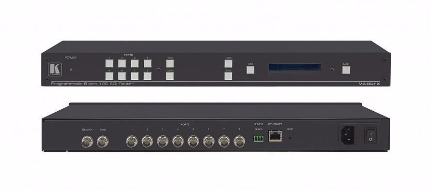 VS-8UFX — матричный коммутатор сигналов SDI c 8 универсальными портами. Каждый порт конфигурируется на режим работы как вход или как выход, обеспечивая изменяемую размерность матрицы в пределах от 1х7 до 7x1. Прибор поддерживает различные стандарты сигналов до 12G HD-SDI.