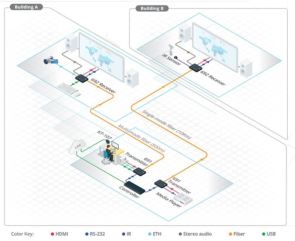 691 — высококачественный быстродействующий передатчик сигналов HDMI, стерео аудио, ИК, RS-232, USB 2.0 и Ethernet на сверхдальние дистанции через волоконно-оптический кабель по технологии HDBaseT 2.0. Передатчик конвертирует входные сигналы в формат HDBaseT и преобразует результирующий сигнал в оптический для передачи по многомодовому или одномодовому оптическому волокну. Приемник Kramer 692 осуществляет обратное преобразование. Комплект приемника 692 и передатчика 691 обеспечивает передачу видеосигналов разрешением до 4K@60 Гц (4:2:0) на расстояние до 33 км при использовании одномодового волоконно-оптического кабеля. Для приема-передачи должны использоваться SFP-модули OSP-MM1 или PSP-SM10 в зависимости от выбранного кабеля и требуемой дальности передачи сигналов.