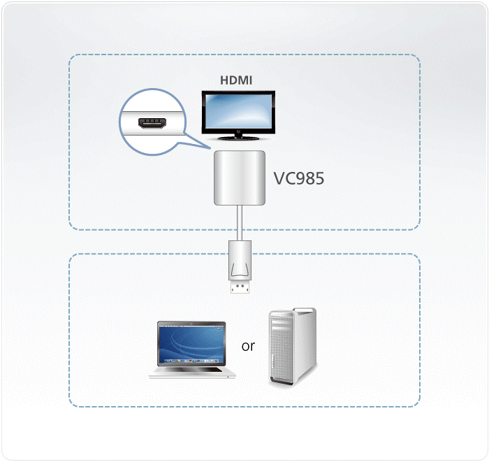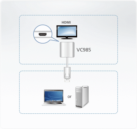 ATEN VC985 позволяет Вам подсоединить устройство оснащенное выводом DisplayPort к HDMI-входу телевизора или другого дисплея.