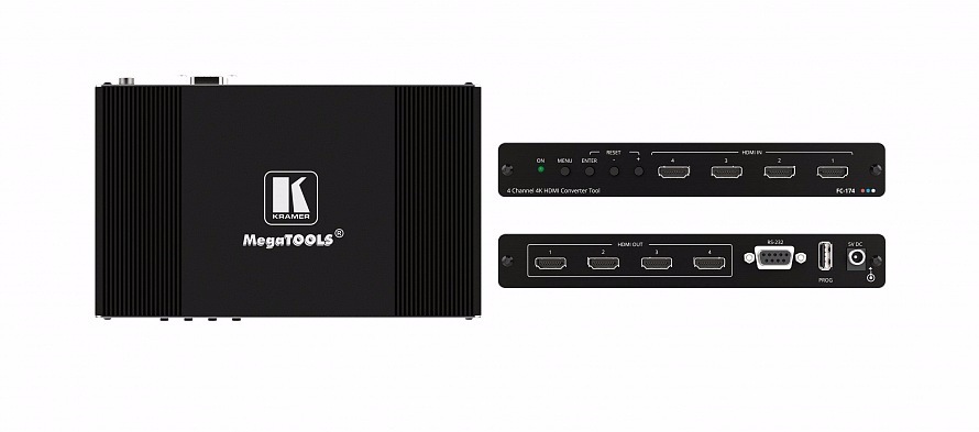 FC-174 – преобразователь сигналов HDMI 4K@60 Гц (4:4:4) в 4K@60 Гц (4:2:0), предлагающий функцию управления EDID с помощью программного решения. Также он обеспечивает взаимодействие HDCP 2.2 и HDCP 1.4 для 4 HDMI источников одновременно. Прибор может использоваться как HDMI-удлинитель, осуществляющий перетактирование и компенсацию АЧХ кабеля по собственной технологии Kramer Electronics.