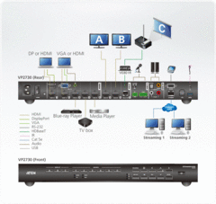 Презентационный матричный коммутатор ATEN VP2730 c семью разно-форматными входами, осуществляющими вывод изображения высокой четкости на один HDBaseT и два HDMI-выхода, дает возможность проводить крупномасштабные презентации, видеоконференции и сотрудничество между локальными и удаленными участниками в залах заседаний, в комнатах для видеоконференций, в лекционных залах или в классах дистанционного обучения.
