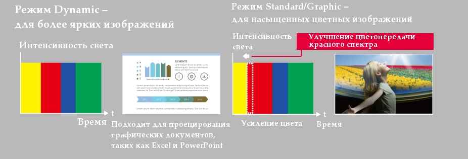 Функция Rich Color Enhancer поддерживает режим Dynamic (Динамический) с упором на яркость изображения и режим Graphic/Standard (Графический/Стандартный) для адаптации под отображаемый контент. Данный режим согласует режим работы цветового колеса для воспроизведения более глубоких и насыщенных цветов в условиях, когда не требуется воспроизводить контент с максимальной яркостью.