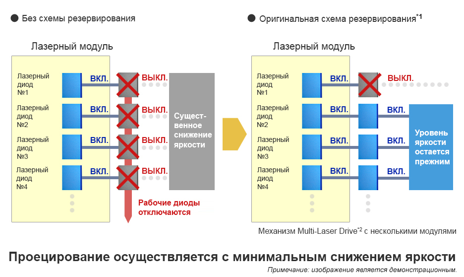 Схема резервирования позволяет минимизировать снижение яркости в случае выхода из строя одного из диодов. Механизм с несколькими лазерами оборудован резервными лазерными модулями, что обеспечивает непрерывный показ во время презентации в случае выхода из строя одного из таких модулей. Это особенно ценно для ответственных вариантов применения, когда очень важно обеспечить непрерывное проецирование.