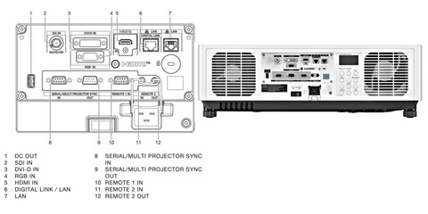 Вход SDI [BNC × 1 (3G / HD-SDI)] Вход HDMI [HDMI 19-конт. × 1]\ Вход DVI-D [DVI-D 24-конт. × 1] Вход RGB 1 [D-sub HD 15-конт. × 1] Serial / Вход Multi Projector Sync[D-sub 9-конт.× 1 (RS-232C)] Serial / Выход Multi Projector Sync[D-sub 9-конт. × 1 (RS-232C)] Вход ДУ 1 [D-sub 9-конт. × 1] Вход ДУ 2 [M3 × 1] Remote out [M3 × 1]L AN [RJ-45 × 1] DIGITAL LINK / Art-net [RJ-45 × 1] Выход пост. тока [USB тип-A × 1(д ля элек тропитания (5 В пост. тока до 2 A))] |