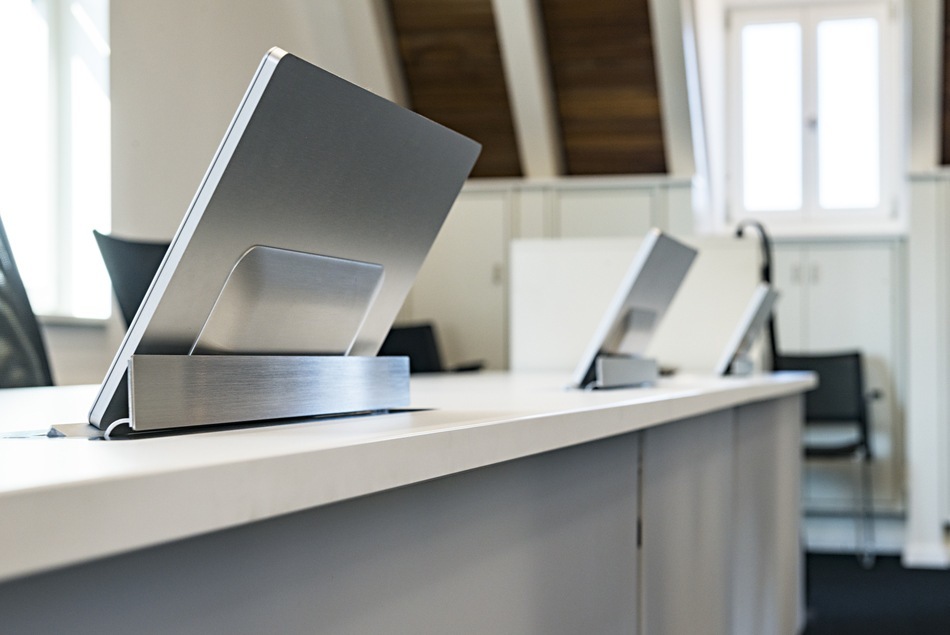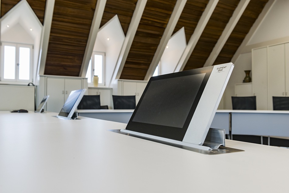 Компактный моторизованный монитор с великолепным экраном FullHD или 4K (15.6") толщиной всего 8 мм для интеграции в столешницу с электронным приводом, поднимающим и опускающим монитор вертикально. Автоматический механизм наклона монитора на угол от 0 до 30 градусов (версия tilt).