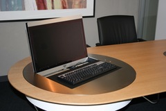 При нажатии на кнопку управления или поступлении внешней команды, монитор поднимается в рабочее положение. Поворот рабочего места осуществляется рукой без усилий. Пространство для хранения мыши также предусмотрено.