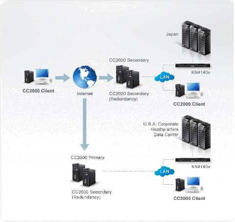 Совместное использование Программного Центра CC2000 с любым продуктом серии «Over the NET™» – например, с IP KVM-Переключателем «KVM Over the NET», Устройством Последовательного Соединения «Serial Over the NET», Устройством Управления Питанием «Power Over the NET» – дает возможность IT-администратору проводить удаленный мониторинг всех установленных устройств и осуществлять дистанционное управление их работой. Принятая архитектура сети, при которой взаимодействие программ в сети строится по схеме «Master-Slave» («Главный-Подчиненный»), обеспечивает защиту передачи ваших данных благодаря наличию таких функций резервирования, как автоматизированное резервное копирование баз данных для главного сервера, подчиненных серверов и устройств, а также актуализация баз данных в реальном масштабе времени. Резервирование гарантирует, что в случае отказа любого сервера, система управления CC2000 продолжит функционирование, поскольку резервный подчиненный сервер примет на себя обязанности отказавшего сервера и будет выполнять их до восстановления его работоспособности. Такое двойное резервирование, когда каждый подчиненный сервер имеет собственного резервного дублера, обеспечивает непрерывное и бесперебойное управление доступом ко всем вашим устройствам.