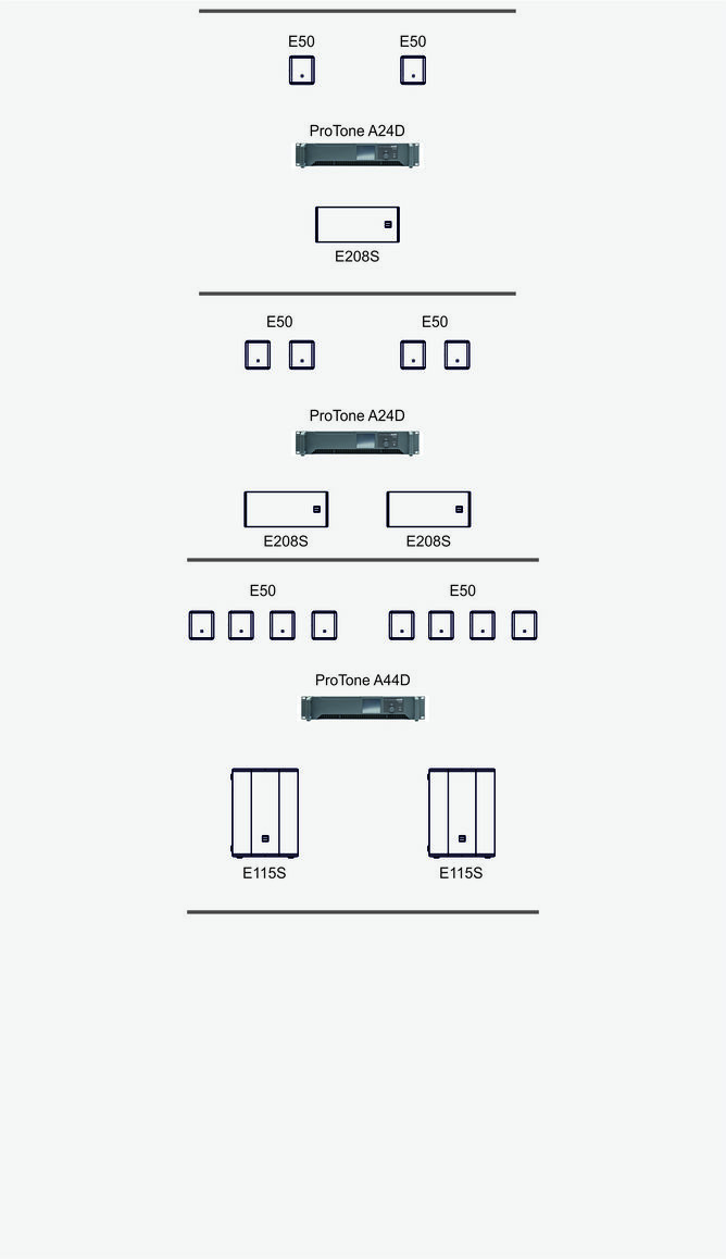 ProTone E50 является идеальным дополнением к более крупным системам в местах где требуется легкая и незаметная установка. Совместно с сабвуфером система идеально подходит в качестве фоновой распределенной системы.