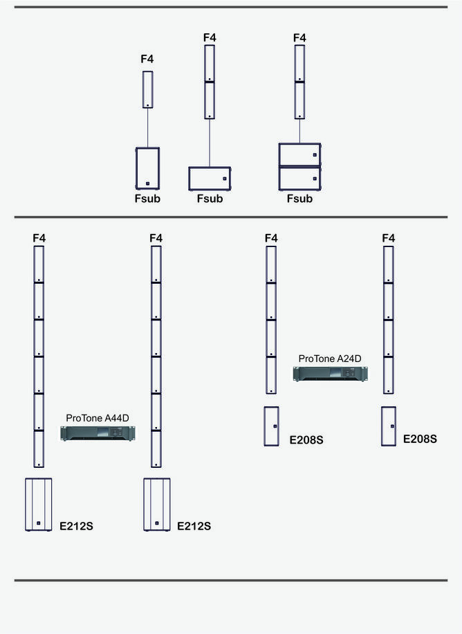 ProTone F4 может быть установлена на стойку, подвешена, или установлена на сабвуфере ProTone F Sub на оригинальном креплении-штанге переменной высоты, входящем в комплект.