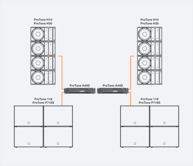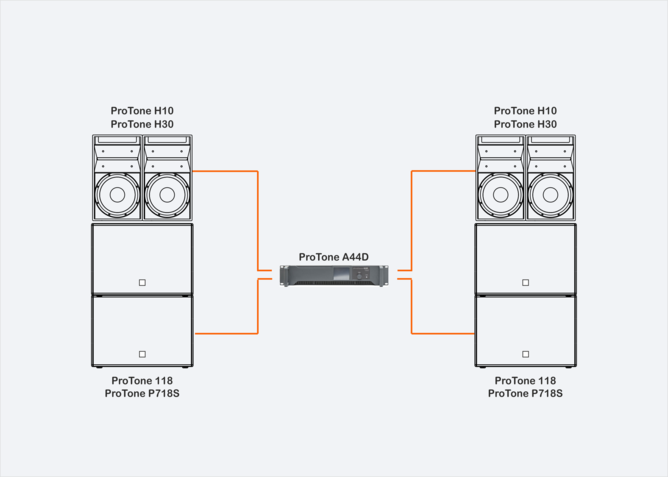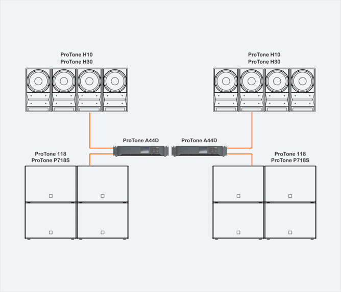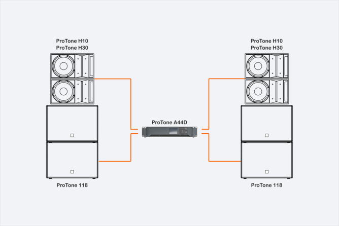 ProTone H10, ProTone H30 - двухполосные многофункциональные элементы линейного массива с фиксированным углом. ProTone H10 и ProTone H30 позволяют создавать легко масштабируемые горизонтальные и вертикальные массивы для выполнения разнообразных задач и эффективно работают на дистанции до 35 метров. Расширенный низкочастотный диапазон до 50 Гц позволяет использовать системы без подключения сабвуферов. Использование сабвуфера ProTone 118 усиливает низкочастотный контур и расширяет частотный диапазон до 30 Гц.