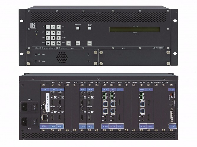 VS-1616DN - высококачественный матричный коммутатор сигналов DVI, HDMI и других на основе универсального шасси. Шасси заполняется модулями, в результате чего можно построить матричный коммутатор размерностью от 2x2 до 16x16 с шагом 2 входа/выхода. В комплект поставки входит шасси, источник питания, Модуль управления и Модуль тестирования, с помощью которой можно контролировать и тестировать каждый вход и выход матрицы.