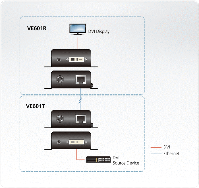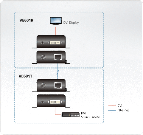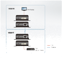 - DVI-видеоудлинитель состоит из двух модулей передатчика (transmitter) ATEN VE601T и приемника (receiver) ATEN VE601R;