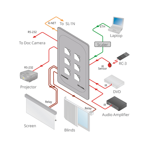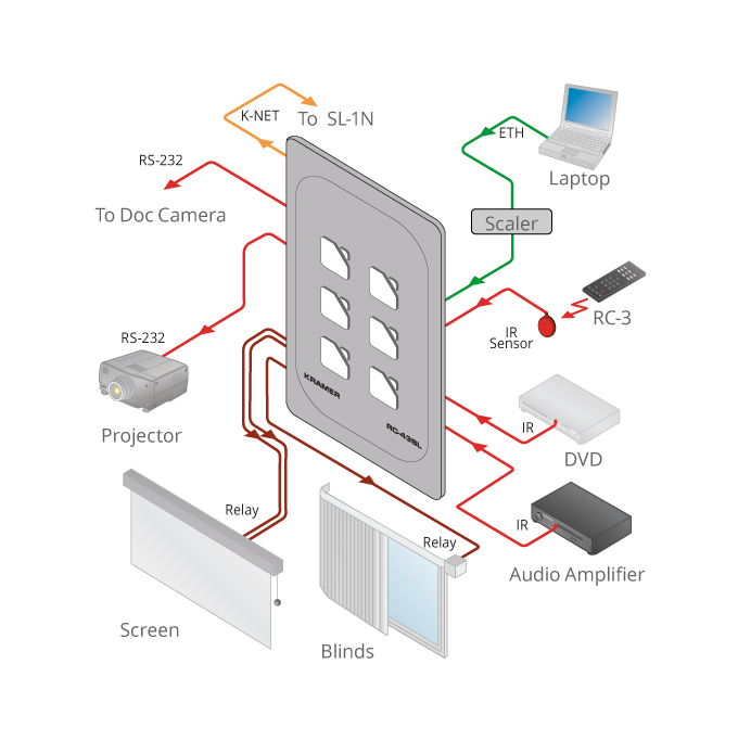 RC-43SL — 6-кнопочная панель управления со встроенным контроллером помещения. Панель предназначена для управления аудио и видеооборудованием, светом, проекционными экранами и прочим оборудованием. Управление осуществляется через сеть Ethernet, интерфейс RS-232, сигналами ИК и замыканием сухих контактов. Взаимодействие с удаленными контроллерами серии SL или RC осуществляется через интерфейс K-NET™.