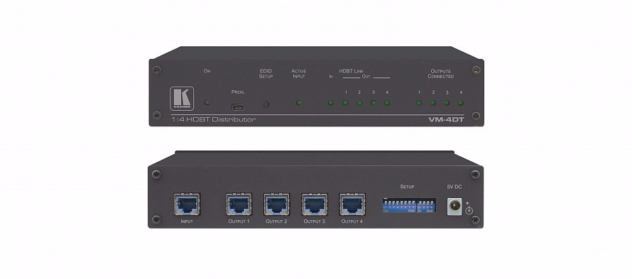 VM-4DT —высококачественный усилитель-распределитель сигналов HDBaseT разрешением до 4K (UltraHD) 60 Гц (4:2:0). Прибор выполняет перетактирование входного сигнала HDBaseT и компенсацию АЧХ кабеля, после чего распределяет сигнал на два одинаковых выхода.
